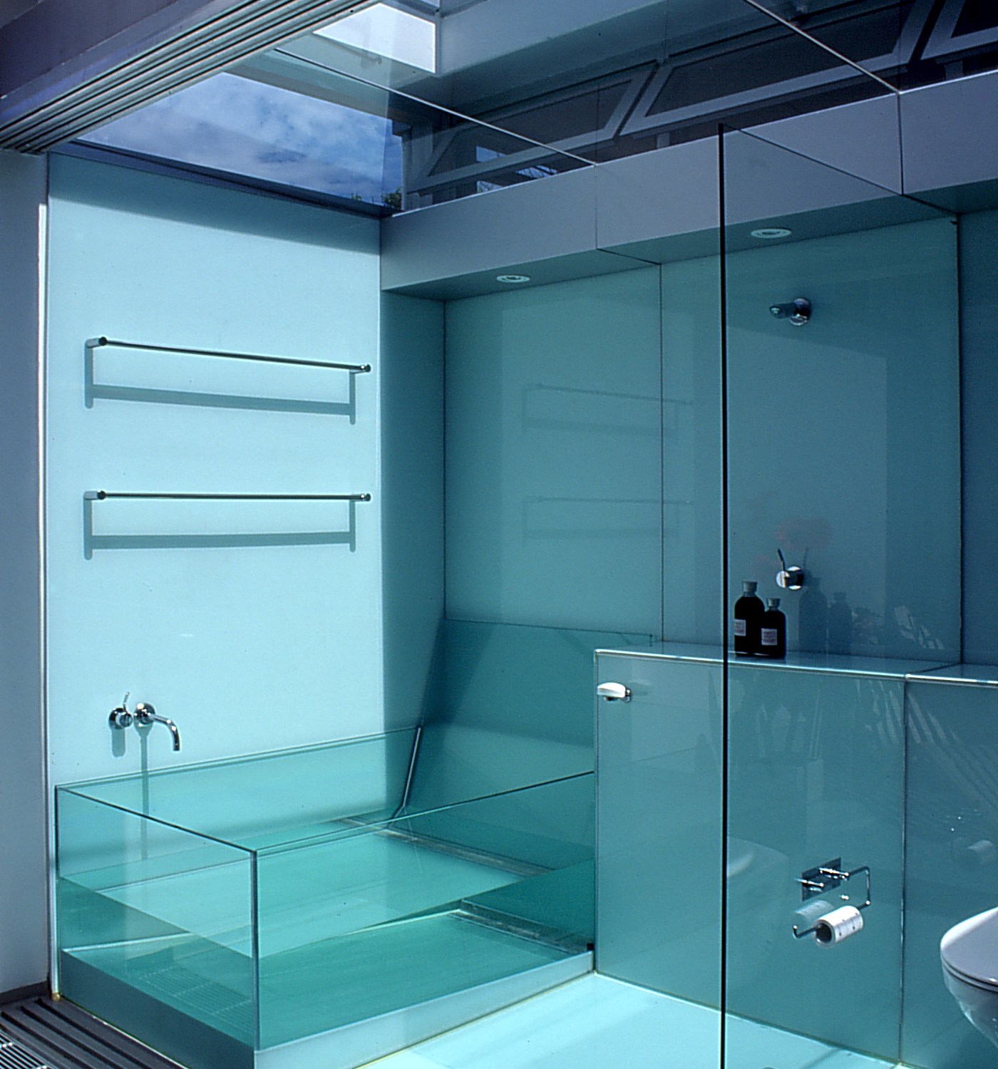 In the bathroom, glass is used as a solid cladding material with the walls and floor lined in white ‘Colourback’ glass. Due to the natural green tint of glass, the bathroom takes on a green tone which complements the ‘water’ theme of the space. Glass technology is explored further in the design of the clear glass bath.